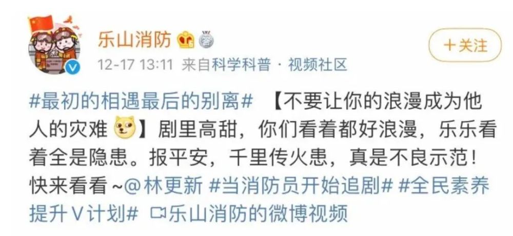 12月17日13时许,四川省乐山市消防救援支队官方微博@乐山消防 发布一段电视剧的视频片段,并针对电视剧中的行为做出提醒。视频显示,黑夜里,严谨(注:剧中角色,林更新饰)在草地上制作孔明灯,并点燃放飞,向爱人报平安。