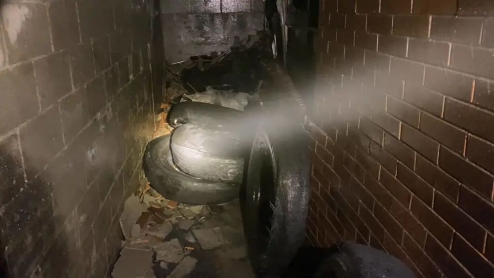 天井内存放的轮胎被尽数烧毁 消防通道被锁 车辆乱停乱放 导致消防车无法通过 已经不是第一次了!